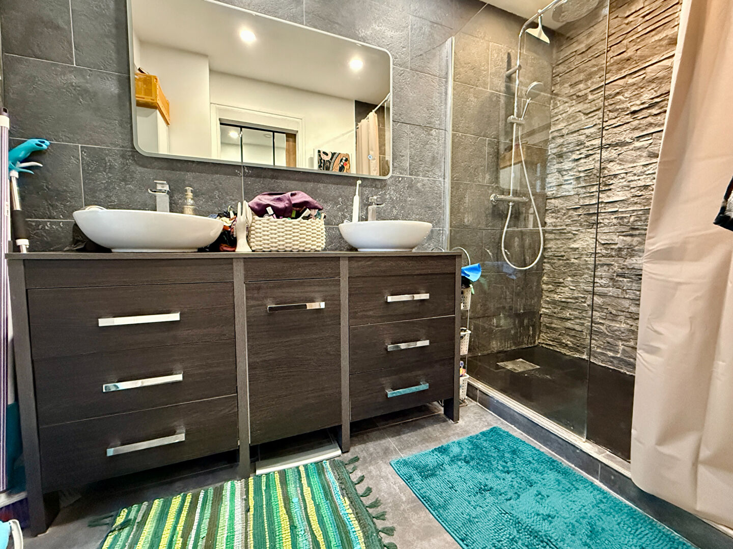 Une entrée donnant sur un grand séjour avec une belle cuisine ouverte et îlot central, une première chambre spacieuse et lumineuse, une seconde chambre pouvant faire office de bureau, une salle d’eau avec de nombreux rangements, WC séparé et une grande terrasse.