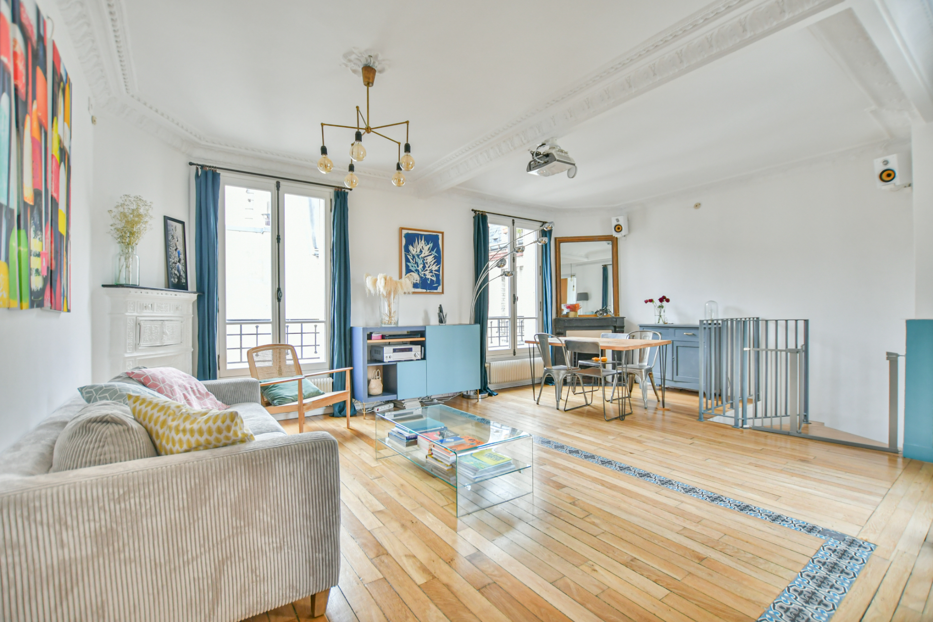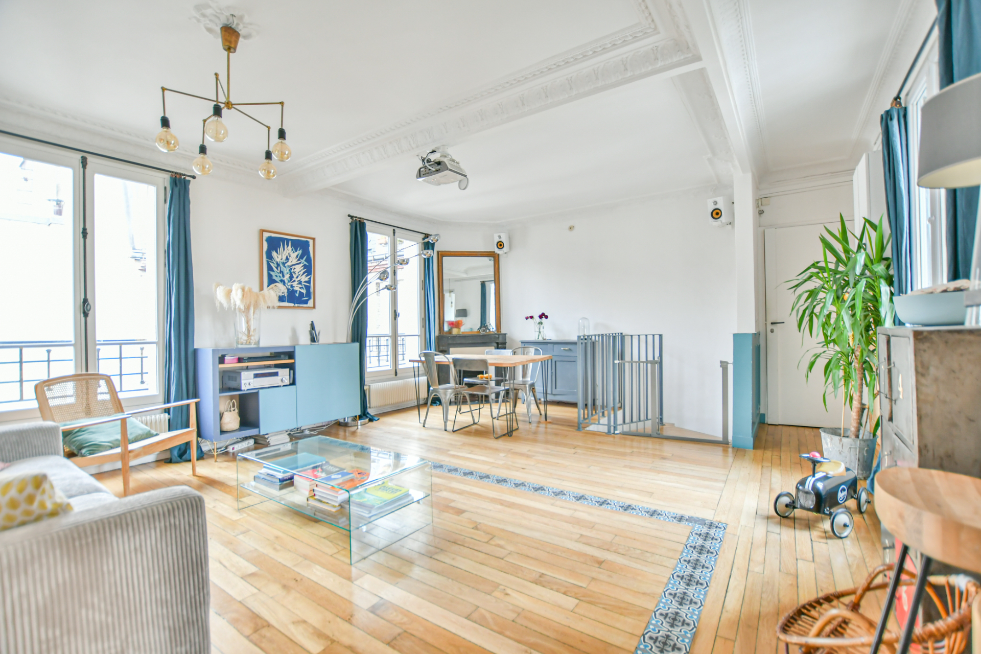 A l’étage supérieur un très beau séjour de 32 m2 ( hors cuisine ) traversant, extrêmement lumineux , exposition Sud/Nord à la vue dégagée sur le sacré coeur.