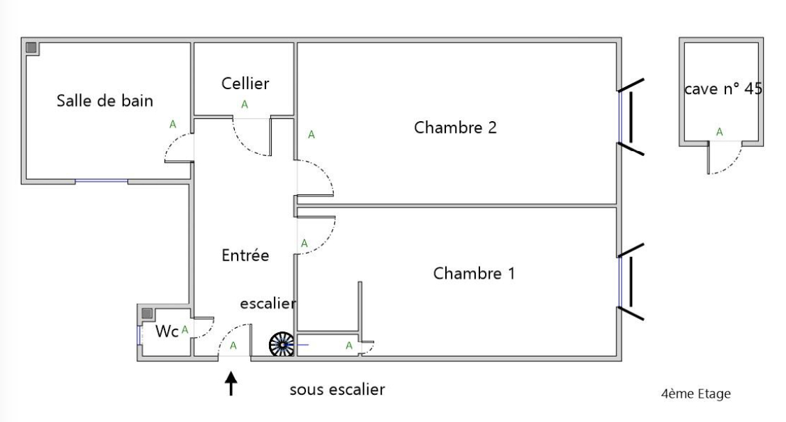 Au premier niveau, ( 4 éme ) : Entrée, WC indépendants, deux chambres sur cour, (un chambre parent avec grand dressing, une chambre enfants avec rangements), une buanderie et enfin une salle de bain avec vasque, douche et baignoire.